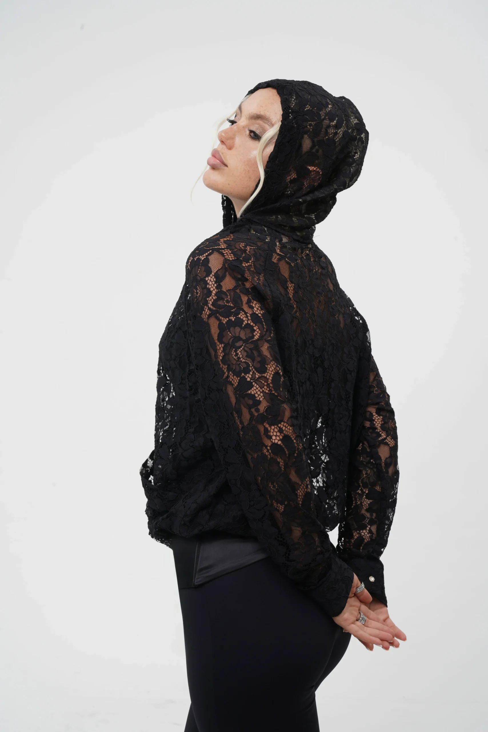 A premium lace hoodie that blends sport and elegance. With its high-low cut and adjustable hem, it transforms effortlessly from casual daywear to an evening look. The hood adds a versatile touch.